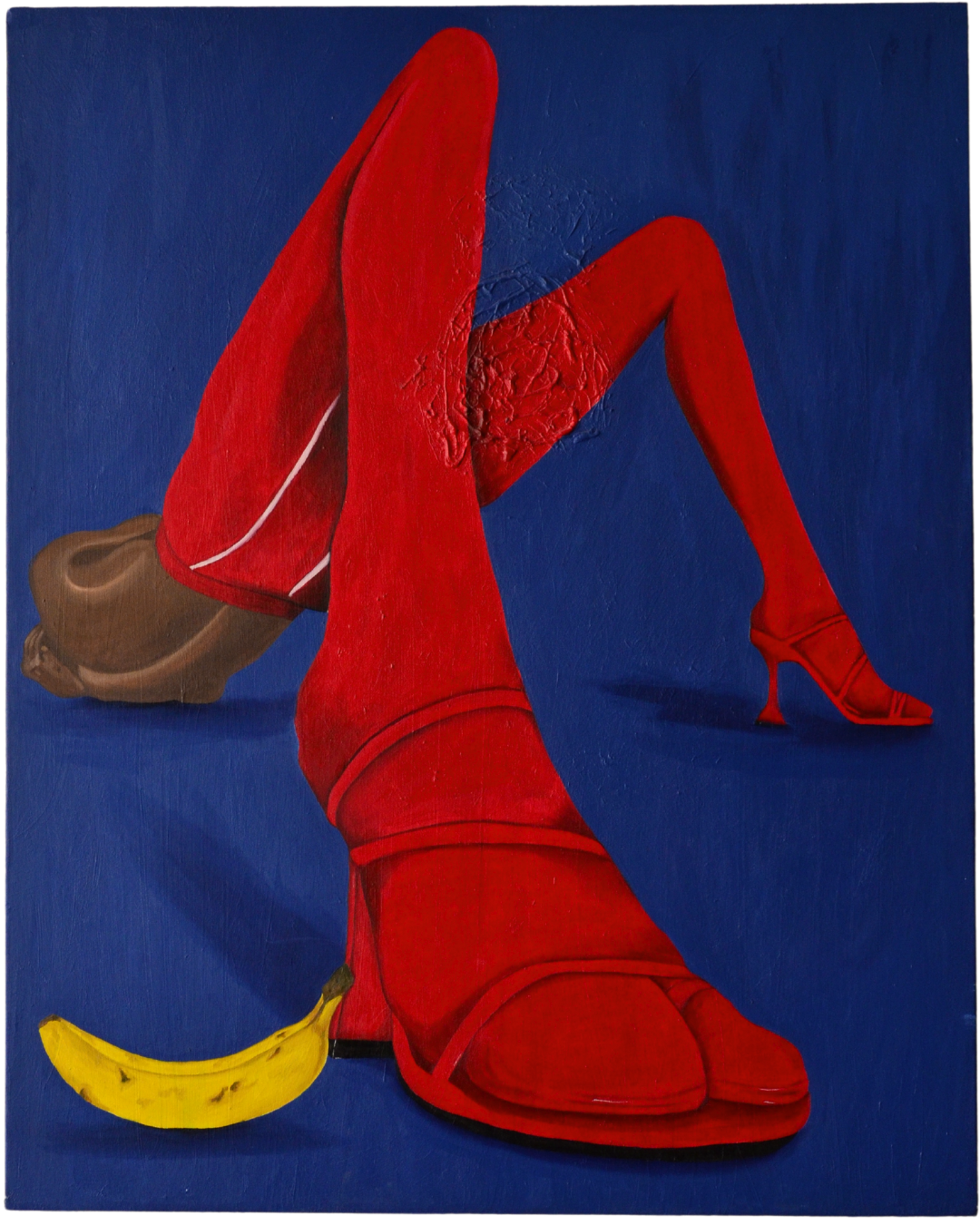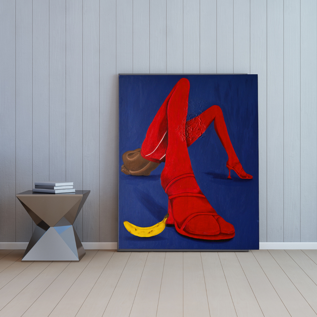 Esta pieza explora el placer femenino desde una perspectiva lúdica y visualmente impactante. Inspirada en la psicología del color, empleo la tríada de colores primarios —azul, rojo y amarillo— no solo para crear una armonía cromática vibrante, sino también para evocar una conexión con la infancia, donde estos tonos suelen asociarse con la inocencia y la ingenuidad.