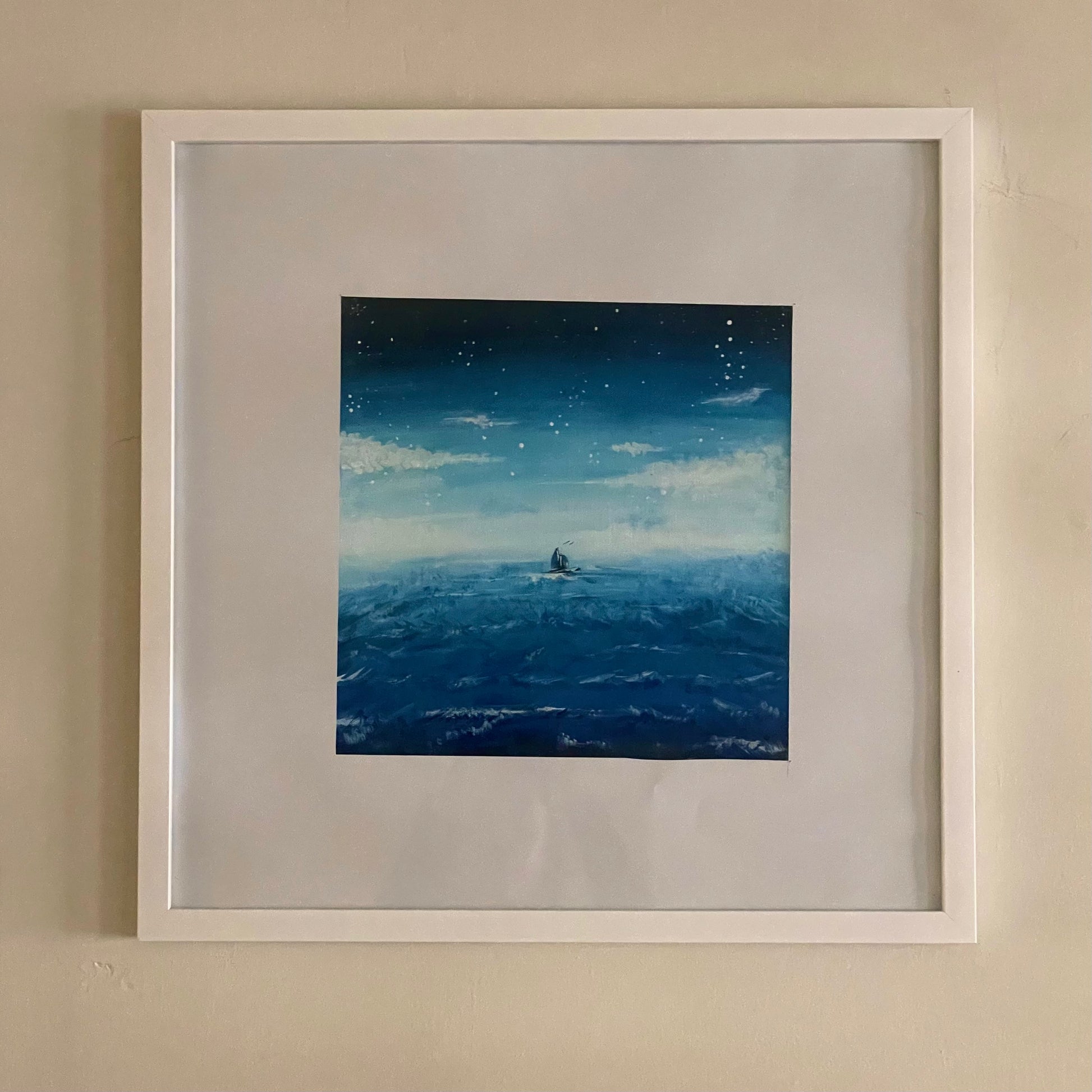 acrílico, con su vasto océano azul y su solitario barco en el horizonte, simboliza el viaje
