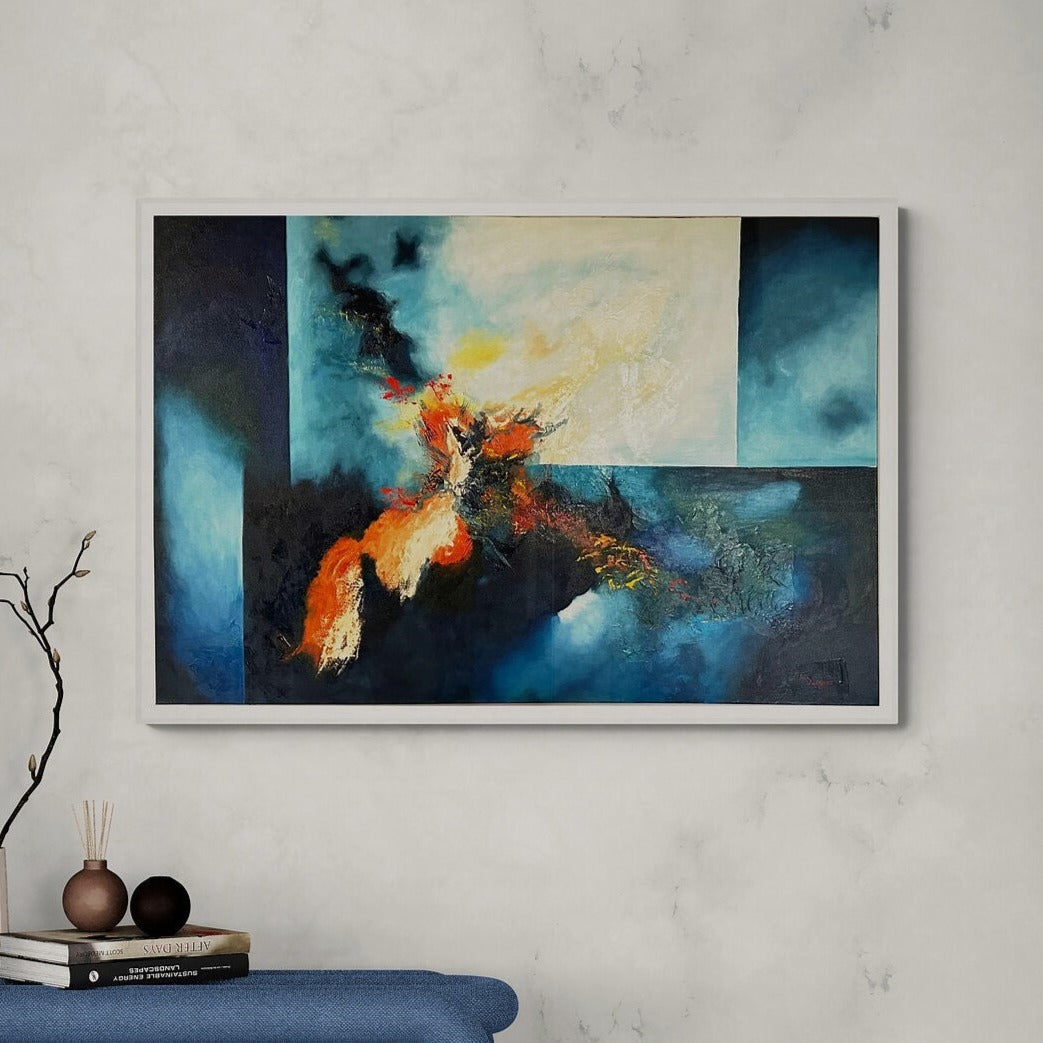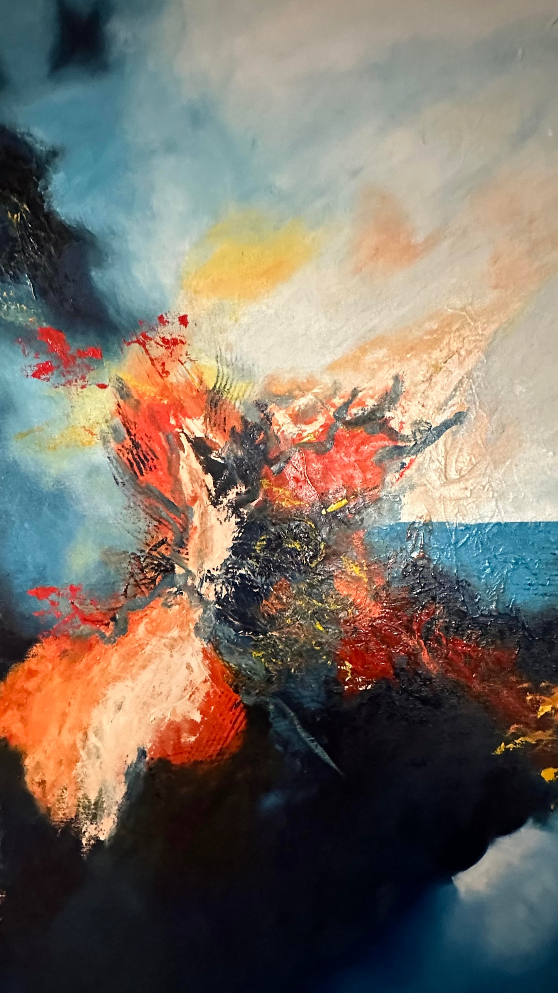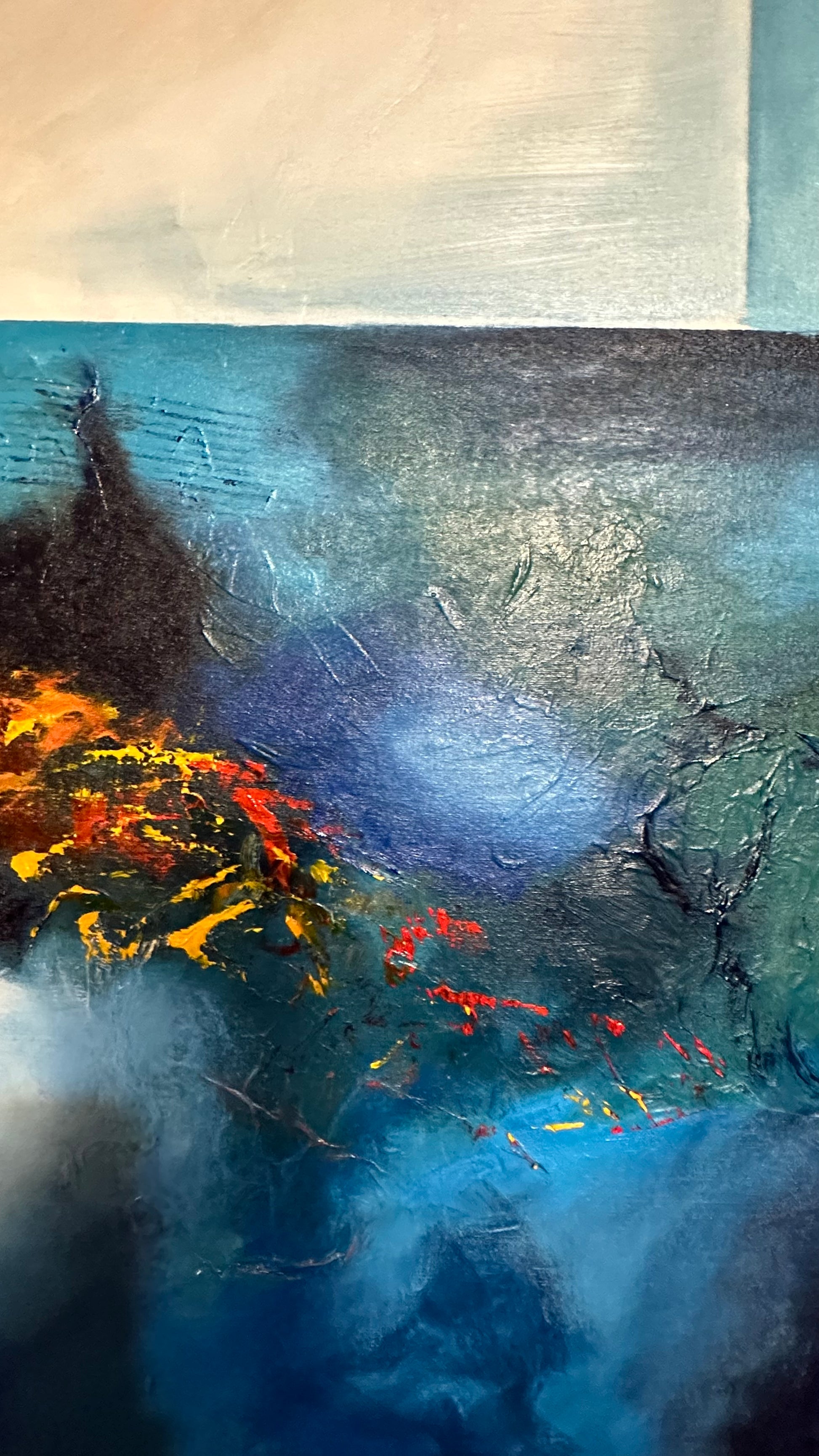 Obra inspirada en tonos azules contrastados con tonos cálidos para resaltar los detalles de luz que trata de asomar sobre la oscuridad