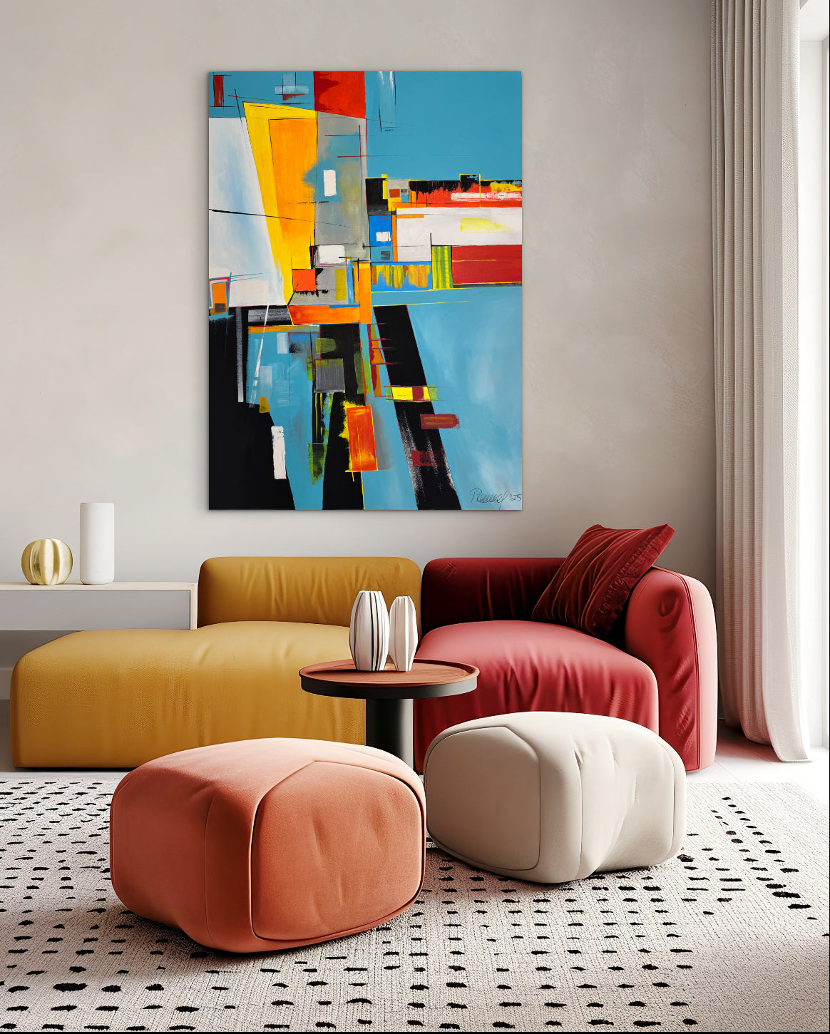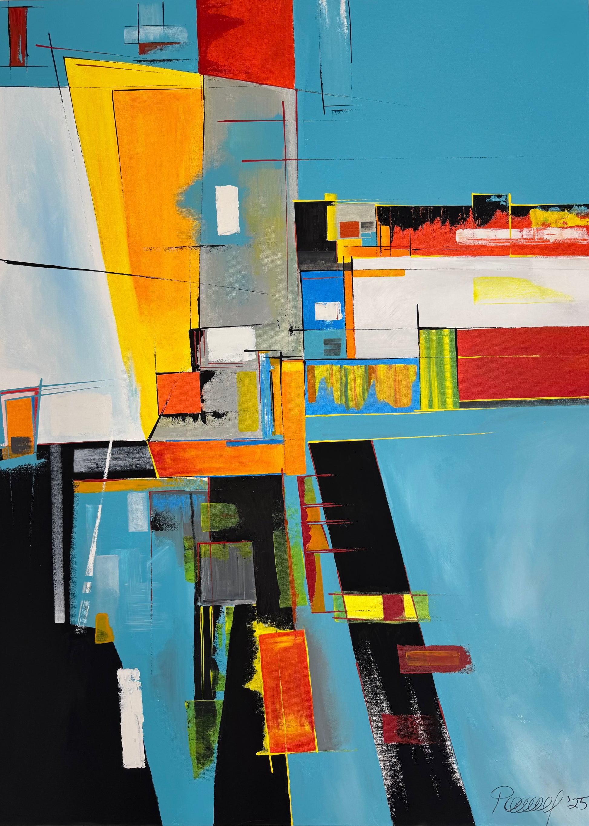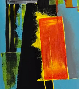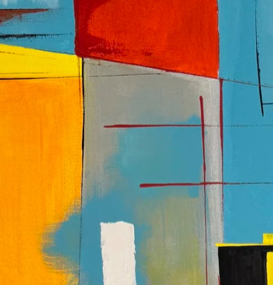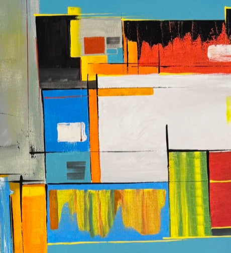 Obra abstracta de figuras geométricas superpuestas, con uso de espátulas para dar texturas y transparencias. Gran variedad de colores contrastantes que guían la mirada del espectador.