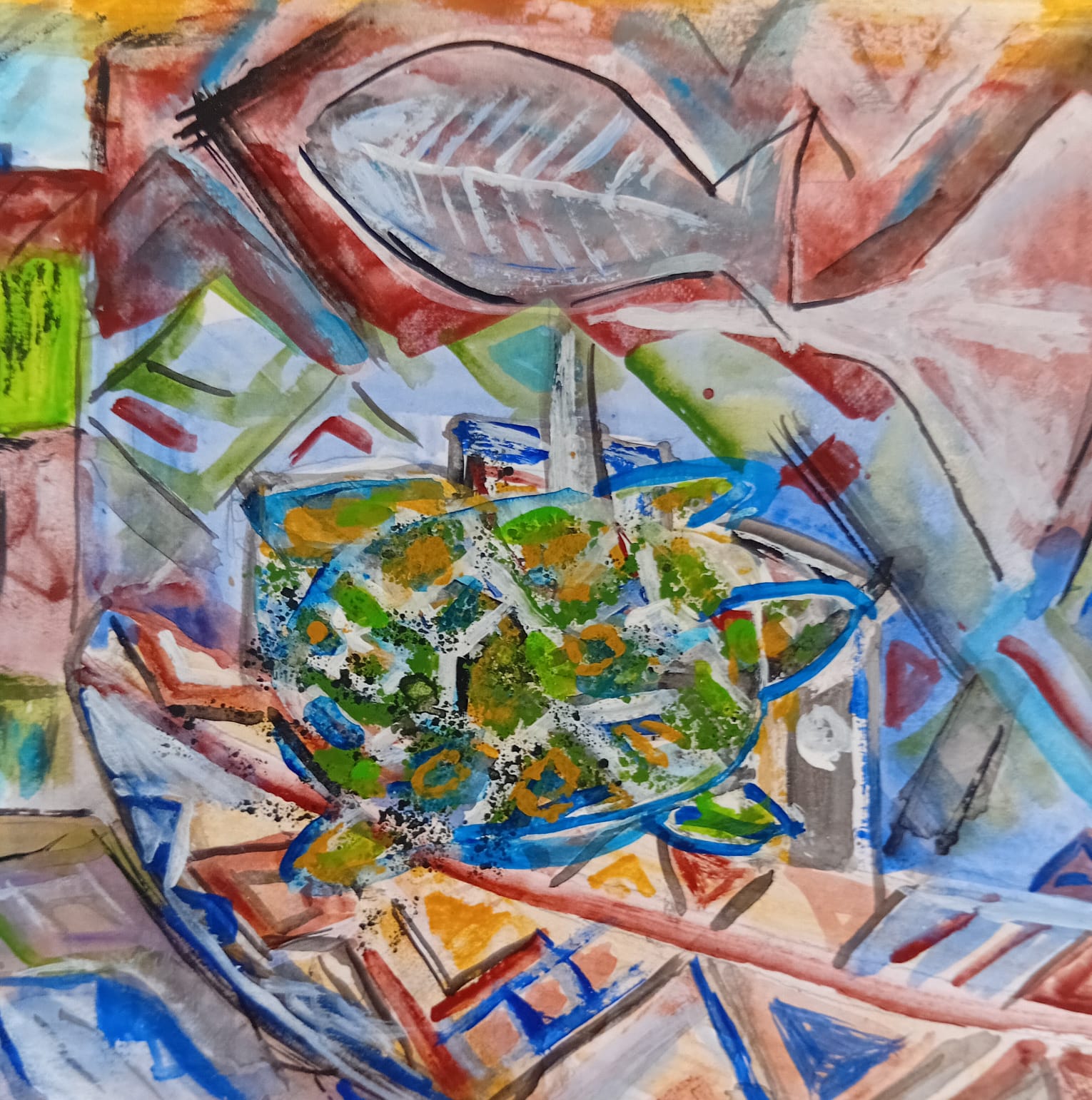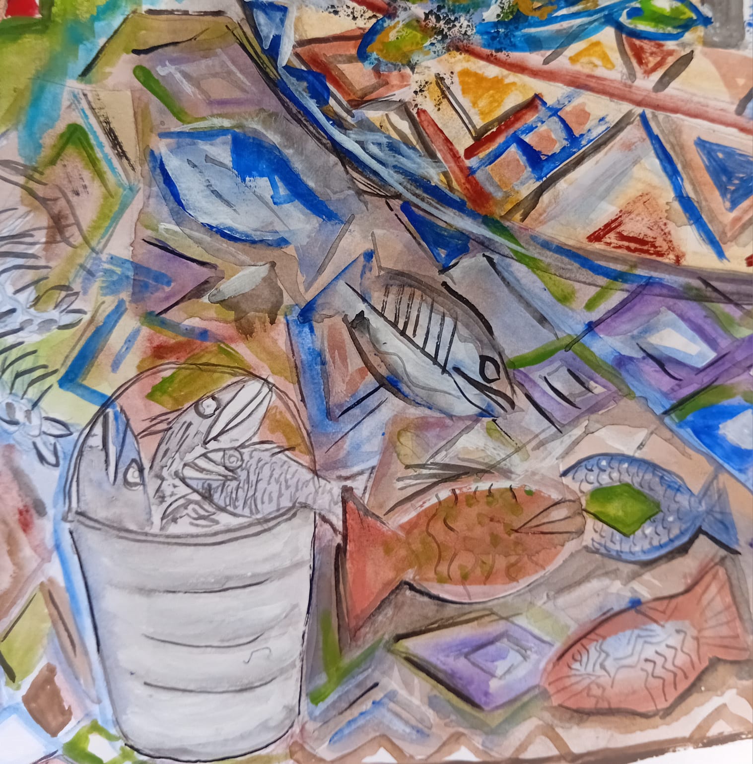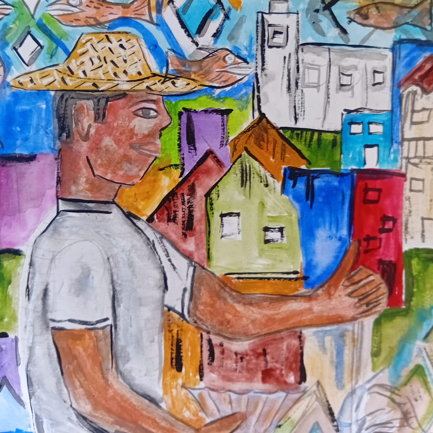 De la serie pescadores y campesinos;, obra hecha en papel Fabriano, refleja la riqueza de la vida laboral en un puerto de Sinaloa, el colorido del mar y la fauna marina.