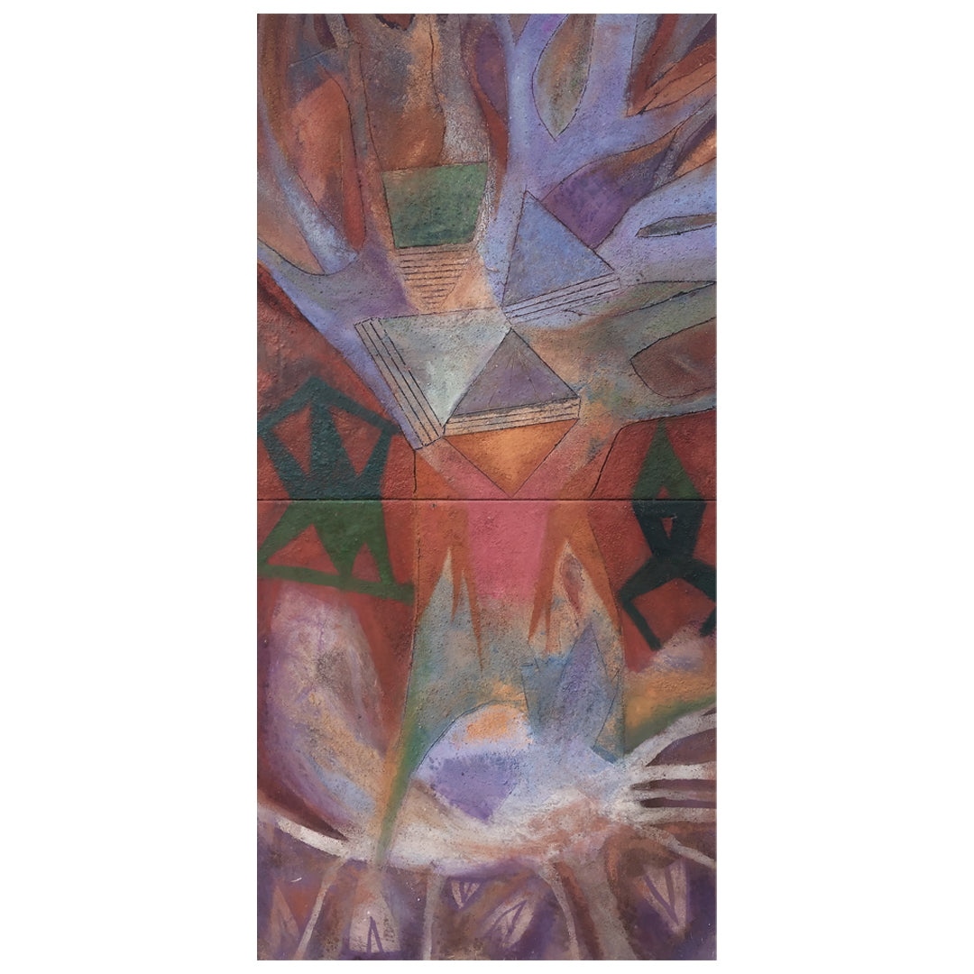 Esta obra forma parte de una serie de pinturas que contienen aspectos de carácter abstracto y simbólico, utilizando la dualidad y el equilibrio como eje principal. La asimetría como eje estético, un elemento para crear composiciones dinámicas usando formatos duales horizontales y verticales. El uso del color, tierras, carbón. ceniza, ceras, oleó, acrílico y pigmentos, materiales que contienen en si aspectos simbólicos, Formas geométricas que interactúan con ambientes orgánicos.