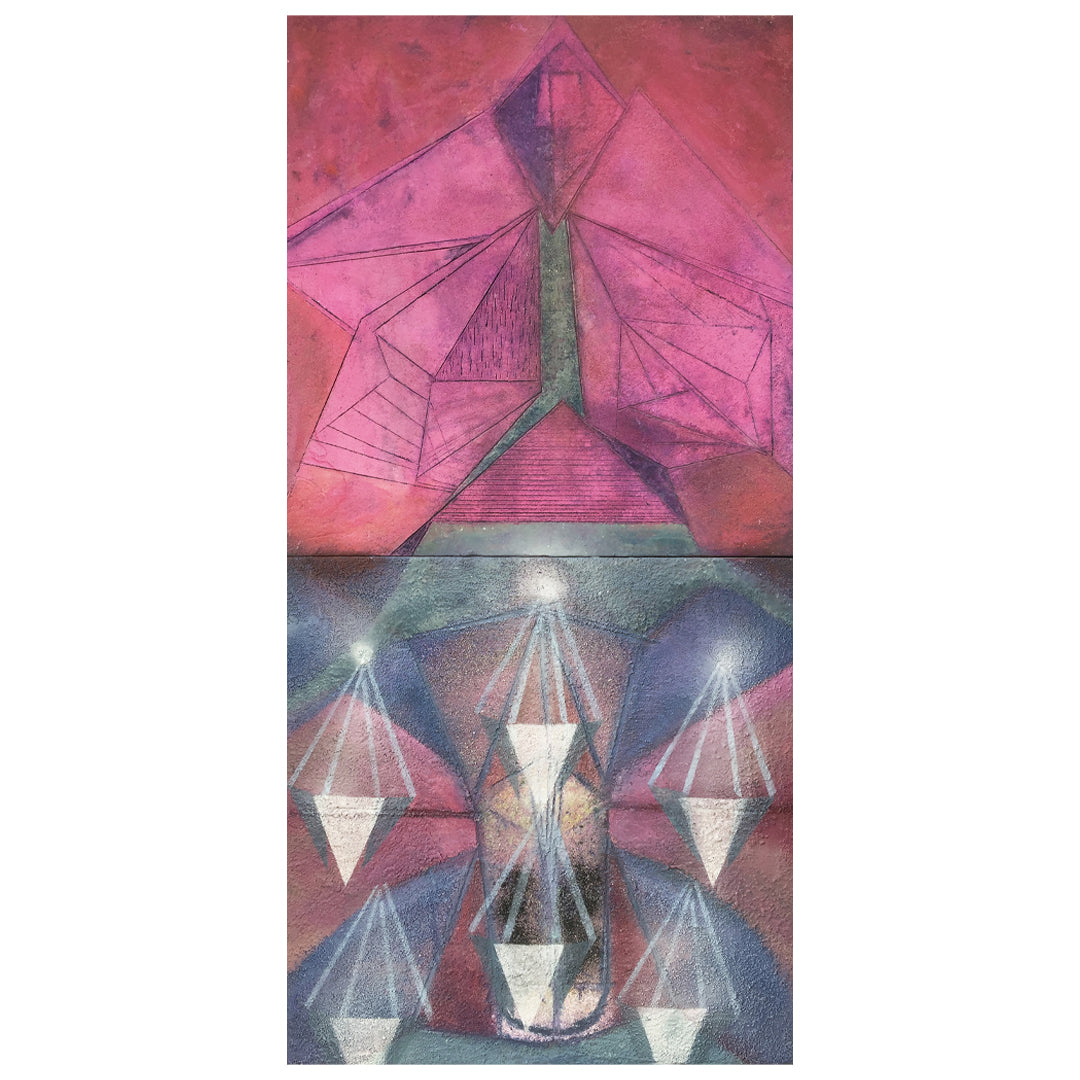 Esta obra forma parte de una serie de pinturas que contienen aspectos de carácter abstracto y simbólico, utilizando la dualidad y el equilibrio como eje principal. La asimetría como eje estético, un elemento para crear composiciones dinámicas usando formatos duales horizontales y verticales. El uso del color, tierras, carbón. ceniza, ceras, oleó, acrílico y pigmentos, materiales que contienen en si aspectos simbólicos, Formas geométricas que interactúan con ambientes orgánicos.