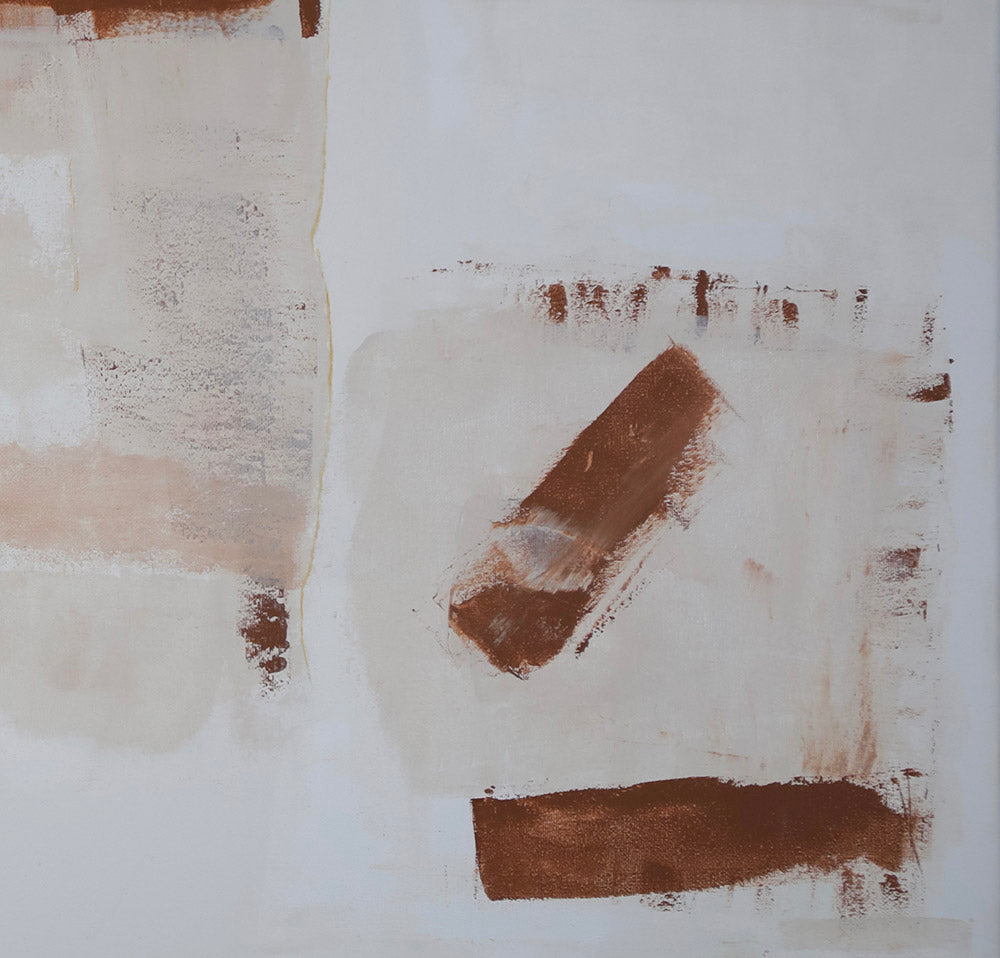 Este título captura la esencia de la obra: figuras abstractas terracota que parecen flotar o detenerse en el tiempo como vestigios de algo latente, casi ancestral, donde predomina el silencio del blanco y la delicadeza de las veladuras claras, que sugieren una pausa, un instante en donde la acción y la contemplación se encuentra otorgando al rojo, una presencia que dialoga sutilmente con el vacío.