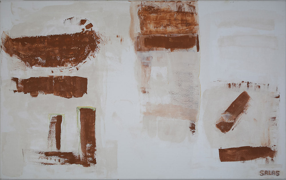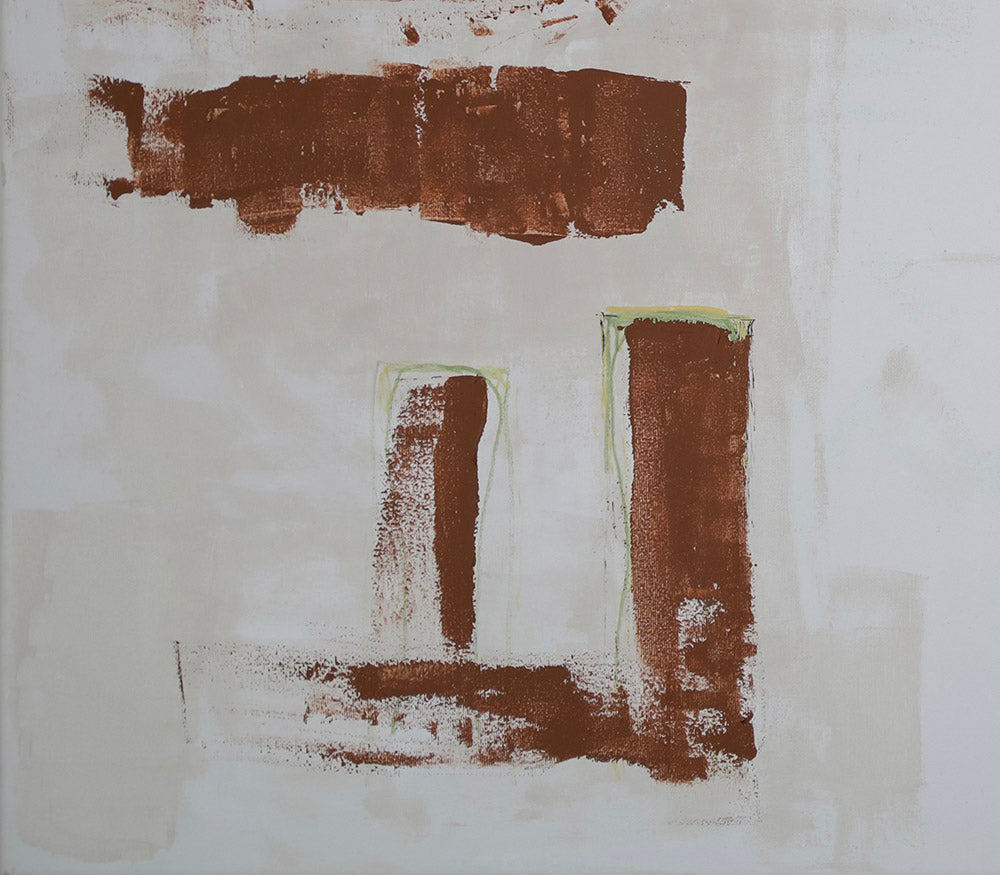 Este título captura la esencia de la obra: figuras abstractas terracota que parecen flotar o detenerse en el tiempo, como vestigios de algo latente, casi ancestral, donde predomina el silencio del blanco y la delicadeza de las veladuras claras, que sugieren una pausa, un instante, en el que la acción y la contemplación se encuentran, otorgando al rojo una presencia que dialoga sutilmente con el vacío.