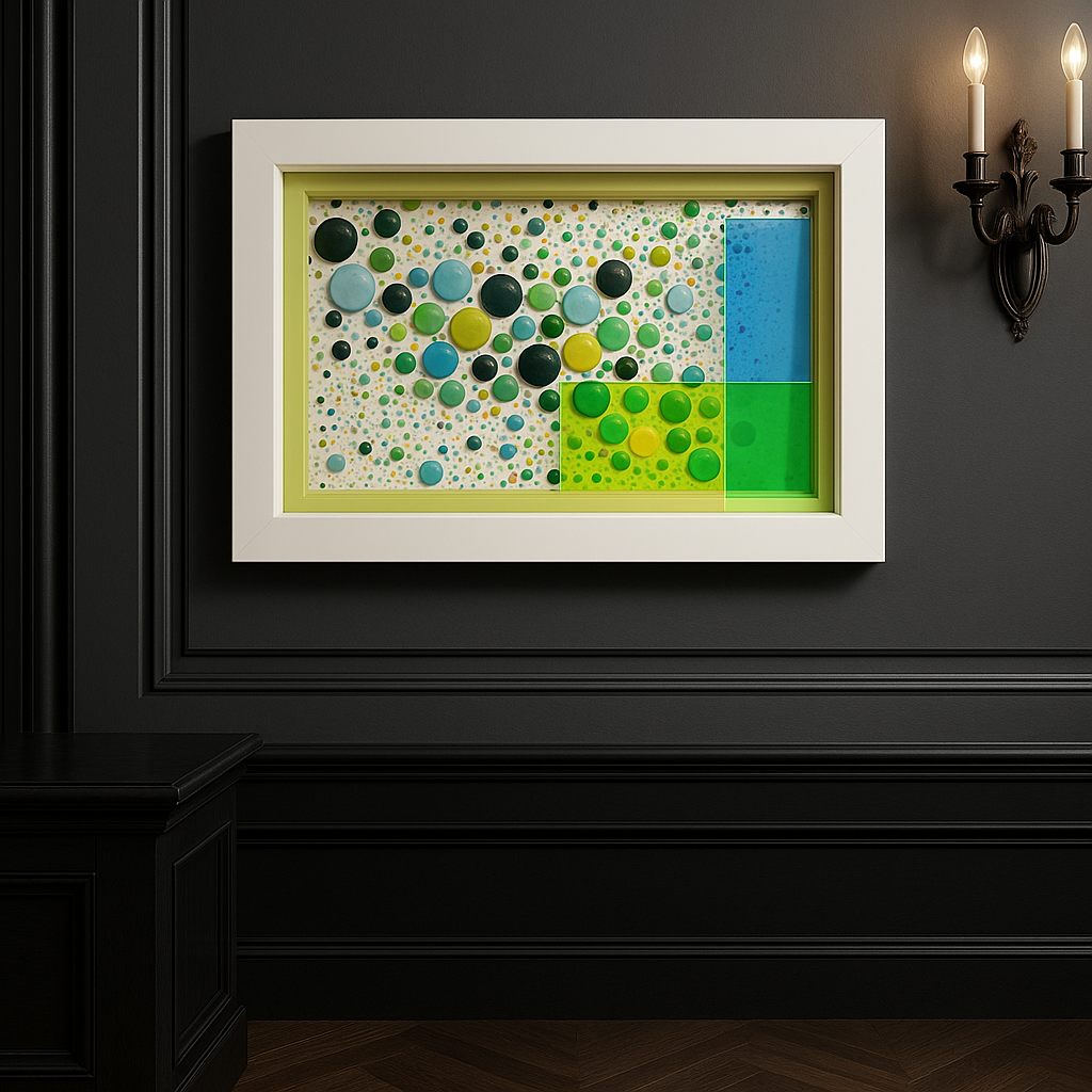 Vibrations, despliega un universo de círculos en expansión, donde cada punto representa una vibración de energía contenida. La diferencia de intensidad en el verde de cada punto evocan la vitalidad de la naturaleza y la pureza del agua, mientras que los elementos translúcidos generan transparencias que invitan a mirar más allá de la superficie.
