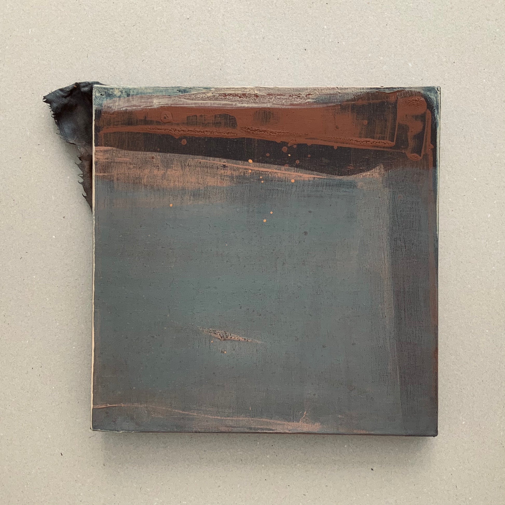 Esta pieza en particular es irregular en el montado de la tela sobre el bastidor con un ligero torcido en la madera de la estructura, sus colores acuosos sobre negros, óxidos, rosa palo y algunos destellos crema (2021).