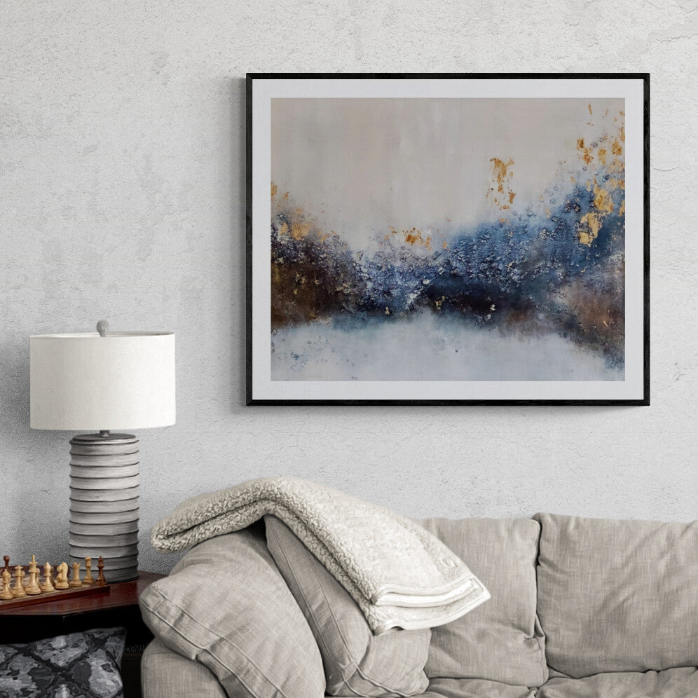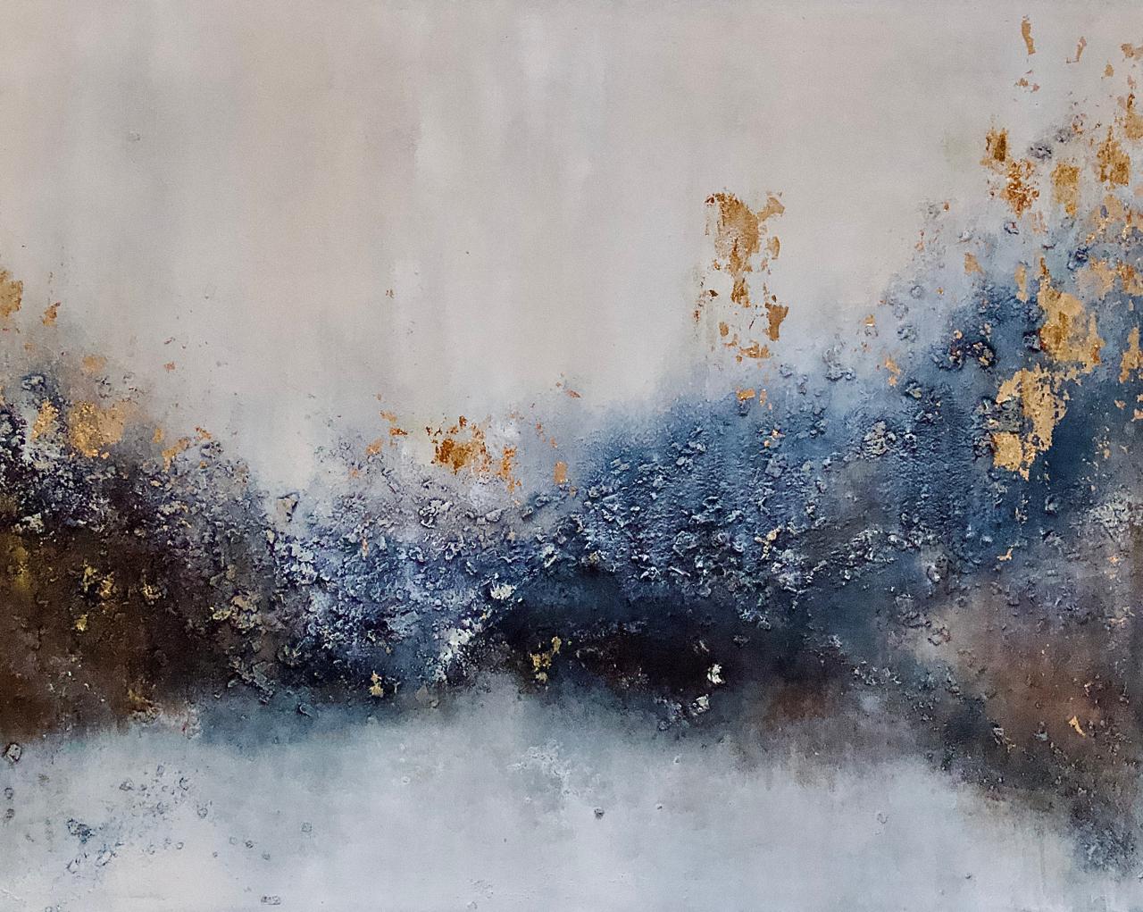En esta obra, el viento fluye con destellos dorados que se entrelazan con los tonos cálidos de la tierra y los matices azules del cielo. Los trazos dorados representan la fuerza y el dinamismo del viento, mientras que los colores tierra evocan estabilidad y conexión con la naturaleza. Los tonos azules aportan serenidad y equilibrio, creando una atmósfera de movimiento armonioso entre lo etéreo del cielo y lo sólido de la tierra. La obra sugiere una danza entre el cambio constante y la solidez, con el azul uniendo ambos mundos.