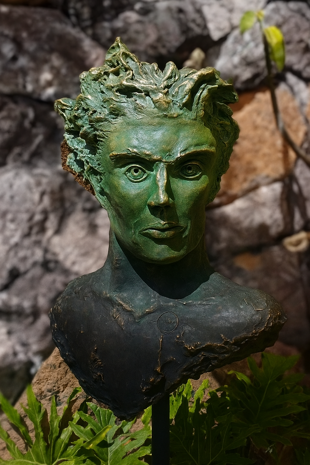 Cabeza masculina penetrante mirada fija, bronce patina verde con tonos negros
