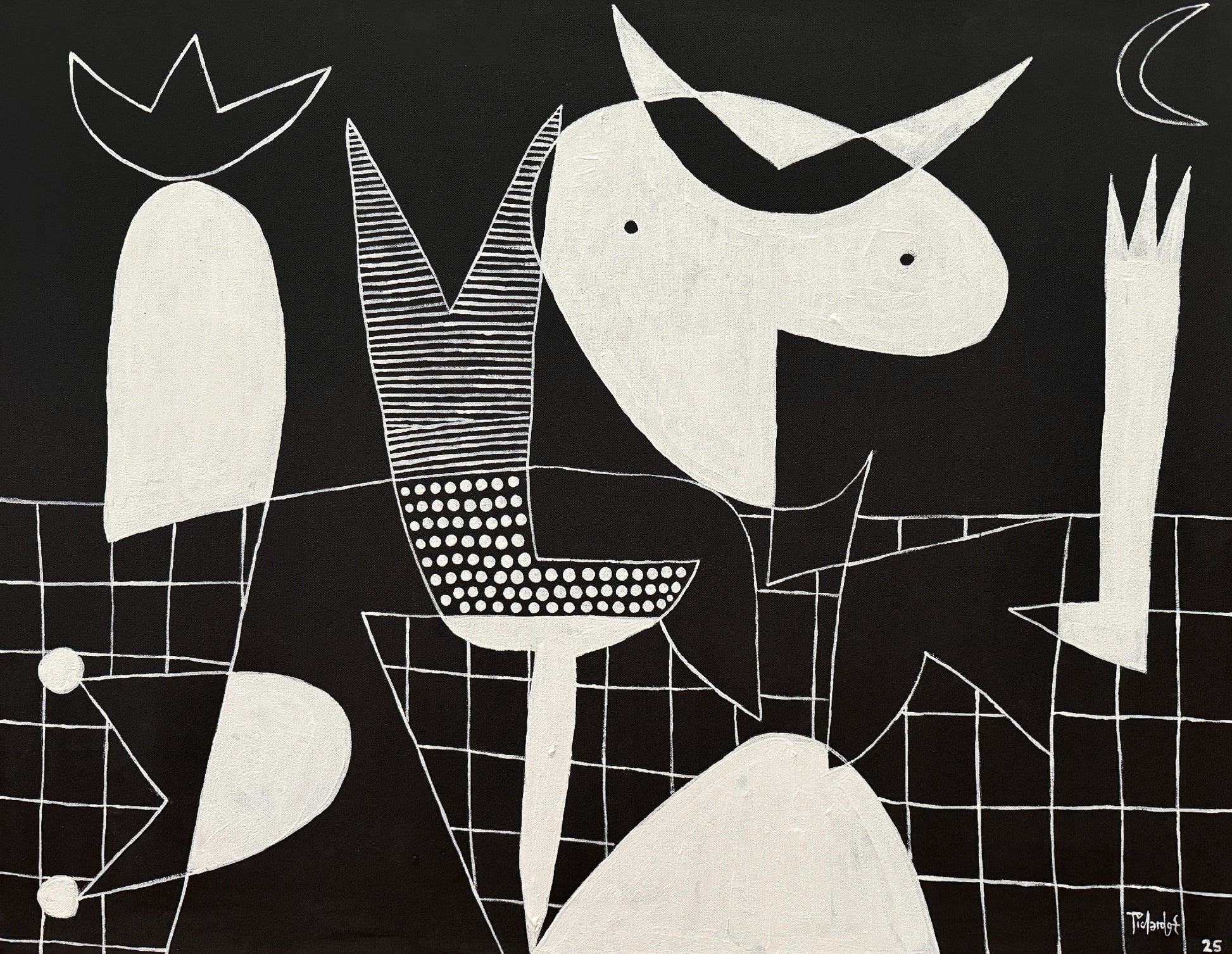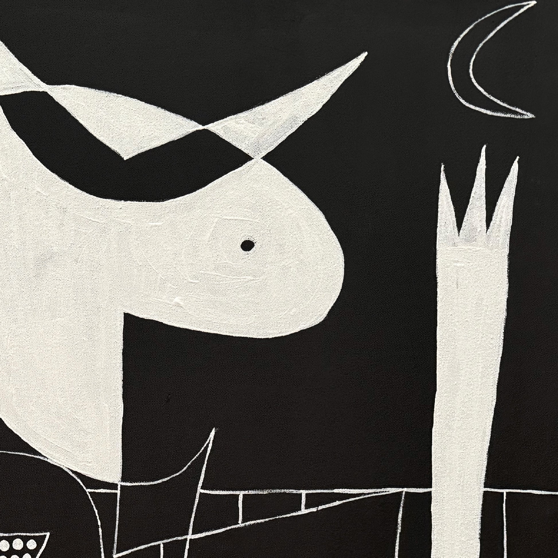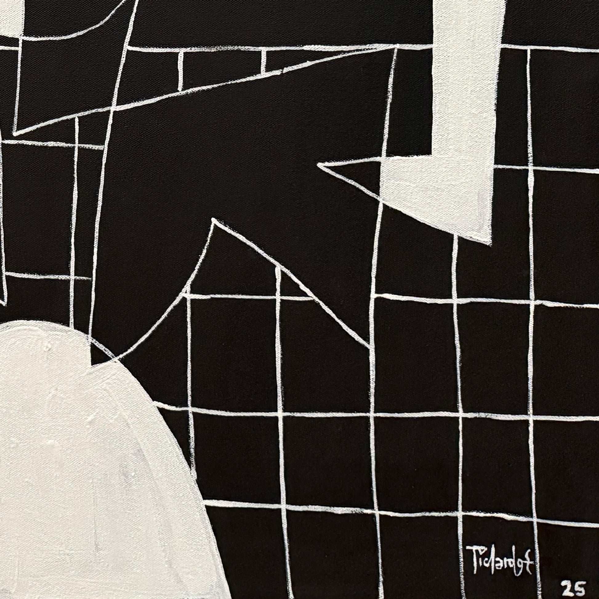 Sobre un fondo negro intenso, emergen figuras blancas que parecen dialogar entre sí: curvas, líneas y puntos que construyen un universo ordenado y libre al mismo tiempo. La cuadrícula y las formas orgánicas generan un equilibrio entre lo racional y lo intuitivo, recordando la síntesis poética de Picasso y Kandinsky, pero reinterpretada con una voz genuinamente mexicana.