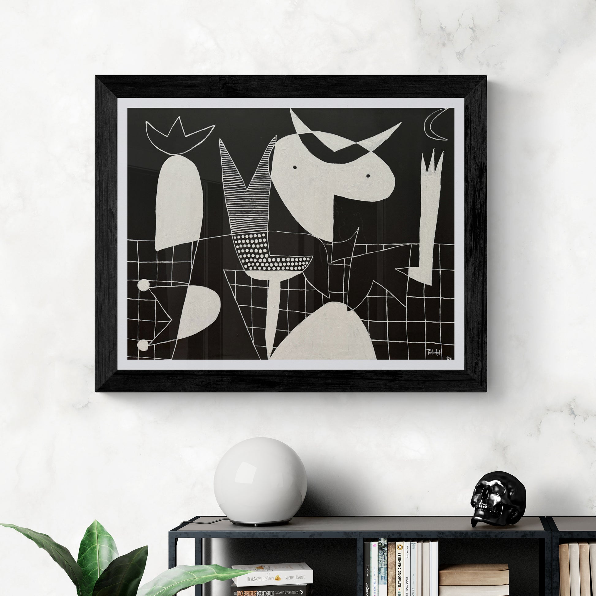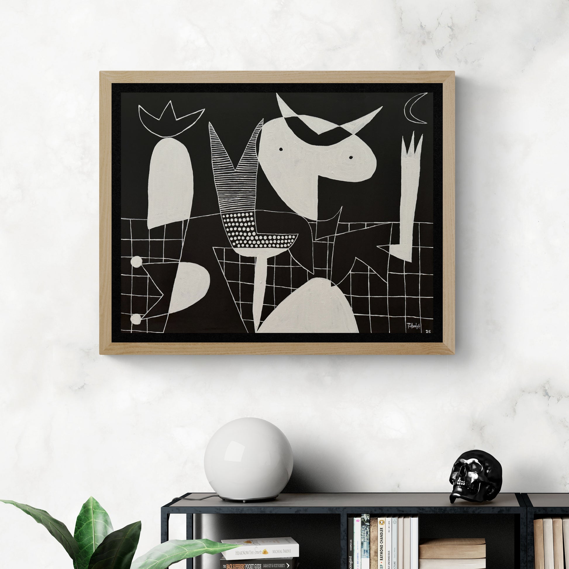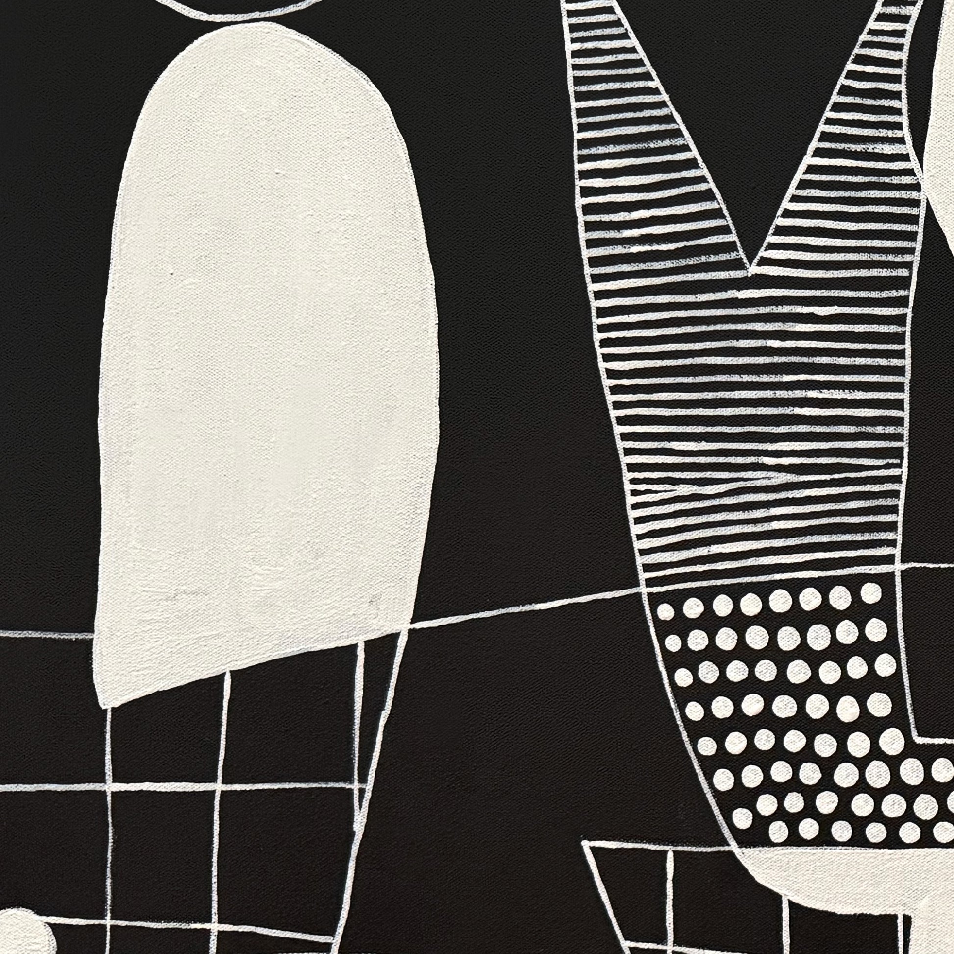 Sobre un fondo negro intenso, emergen figuras blancas que parecen dialogar entre sí: curvas, líneas y puntos que construyen un universo ordenado y libre al mismo tiempo. La cuadrícula y las formas orgánicas generan un equilibrio entre lo racional y lo intuitivo, recordando la síntesis poética de Picasso y Kandinsky, pero reinterpretada con una voz genuinamente mexicana.