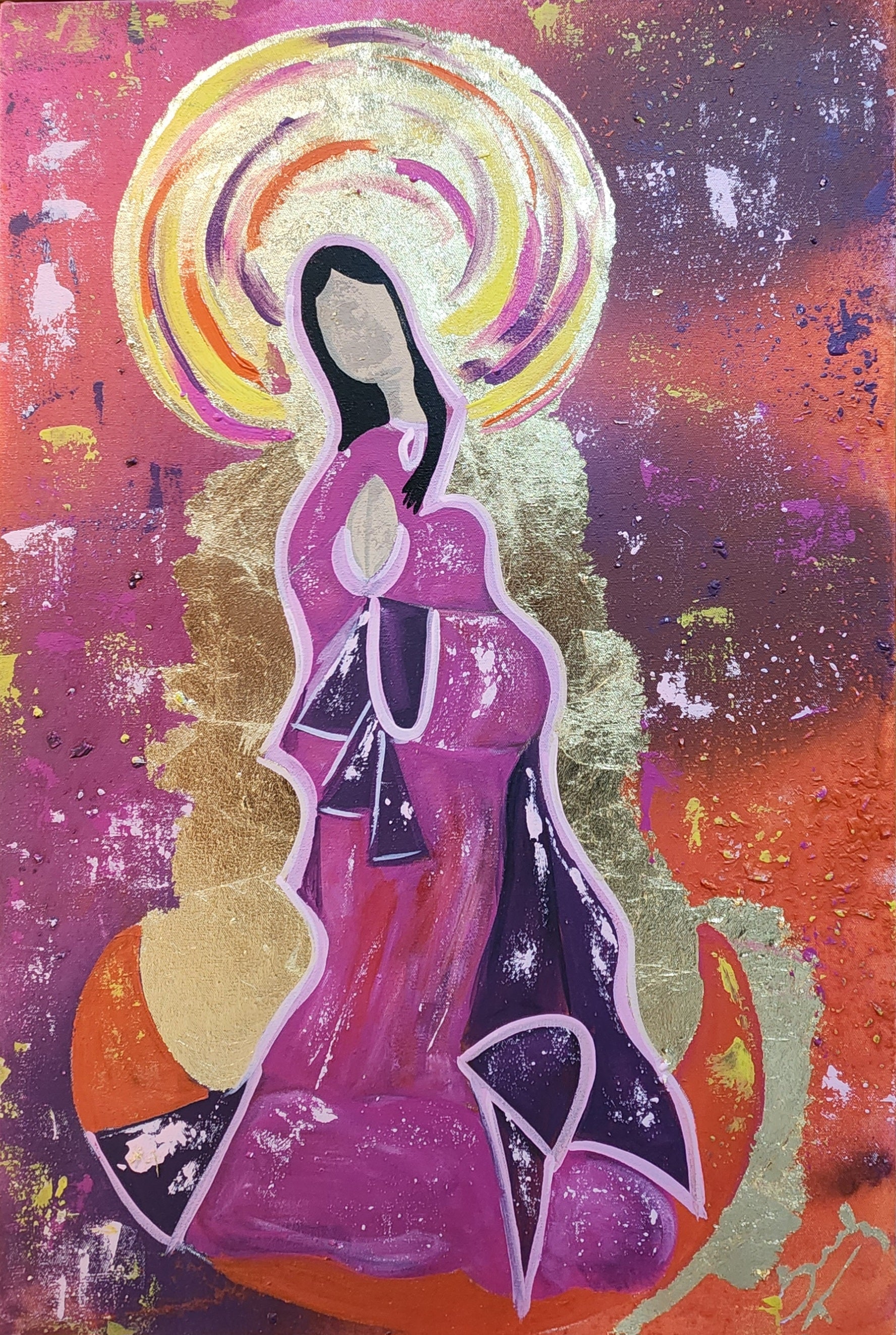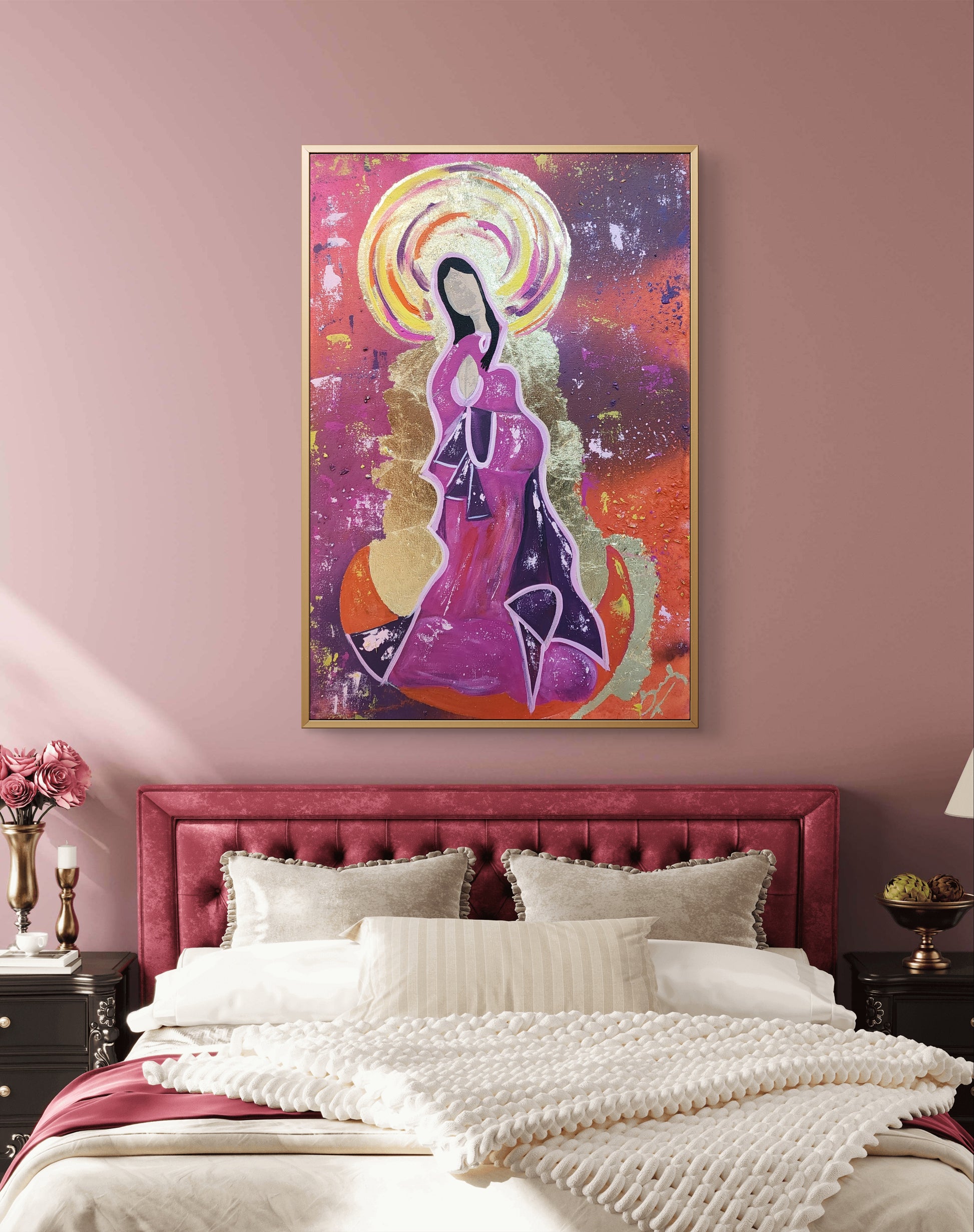 Así es María, llena de vida, alegría y amor. En esta representación de Guadalupe, la hoja de oro recubre el manto como señal de fusión entre lo humano y lo divino.