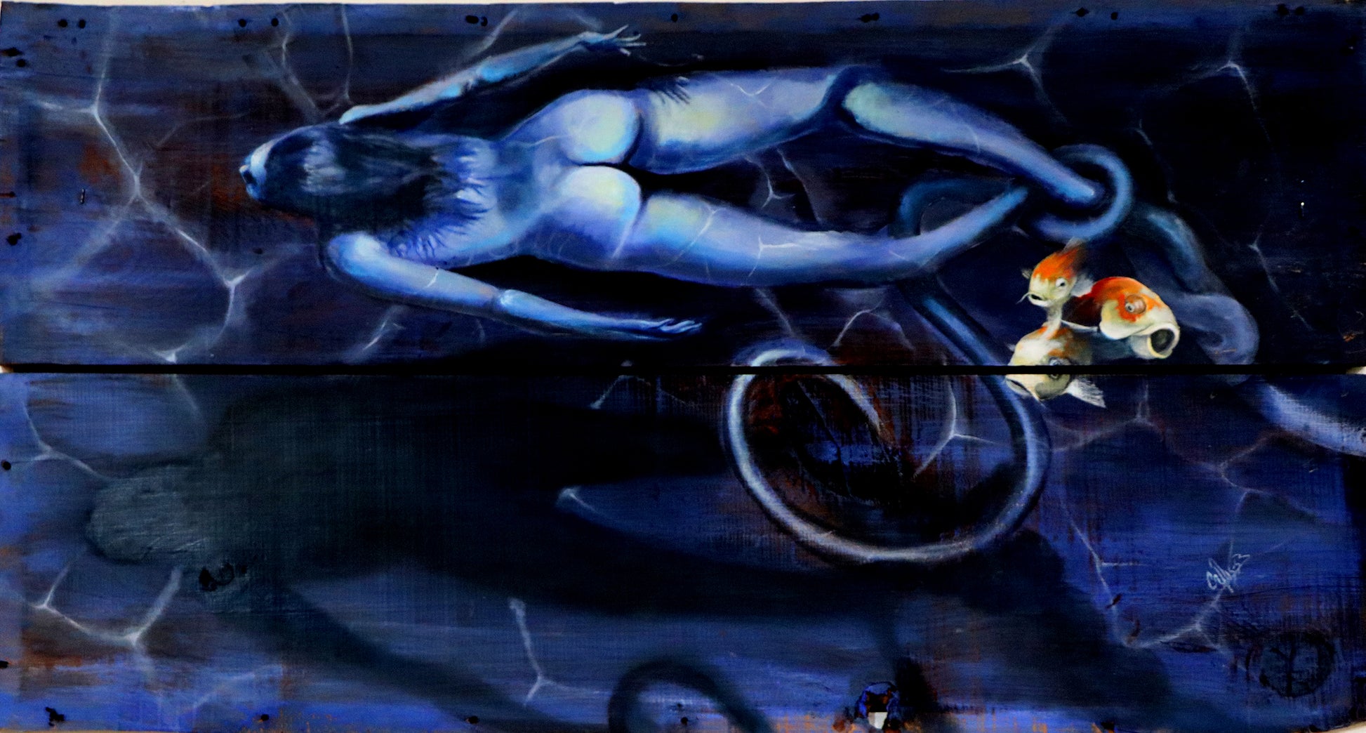El momento en que Tlanchana brinda múltiples peces a los pescadores, pues esta feliz y por ello vuela en sus aguas. Madera