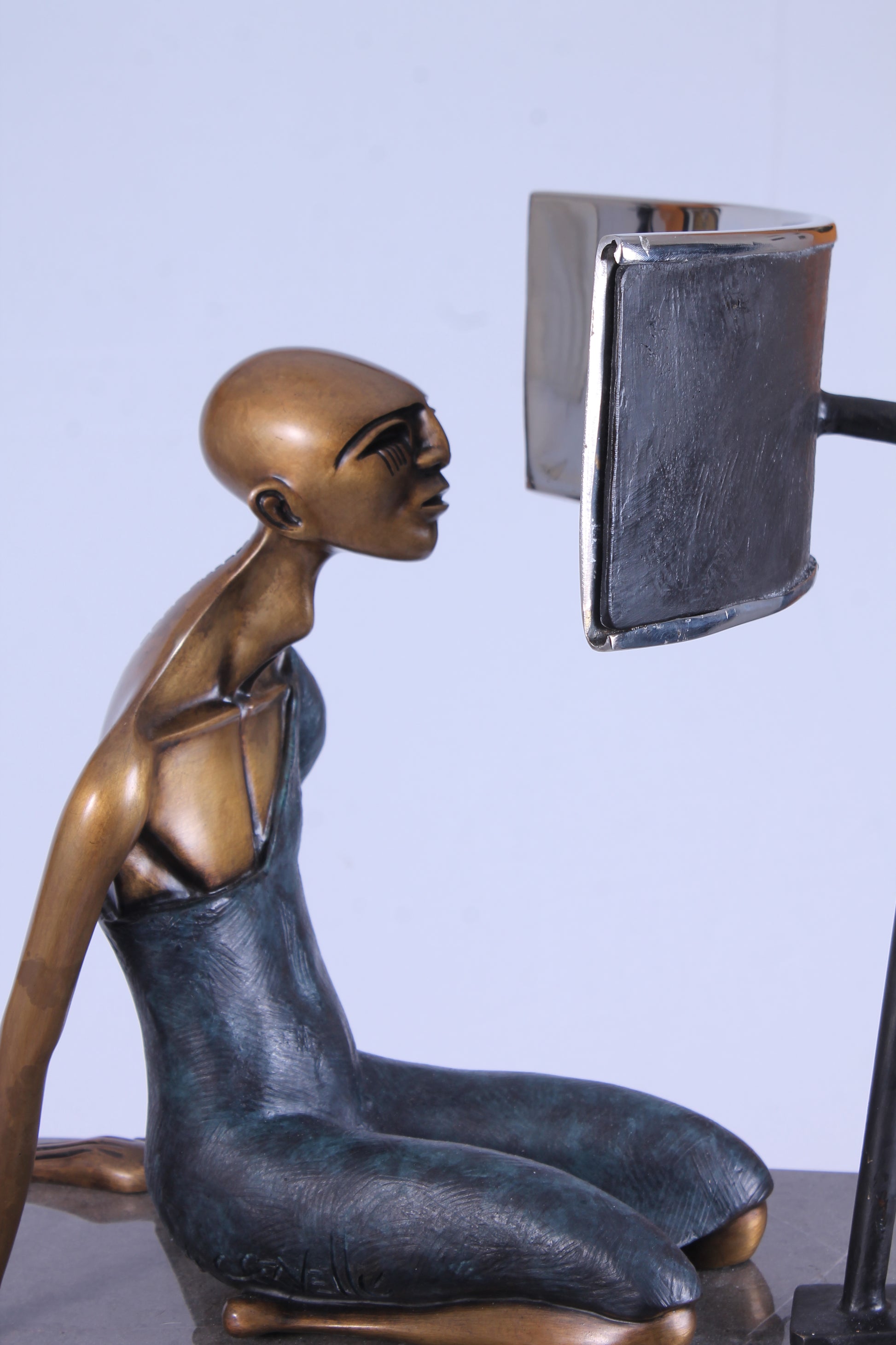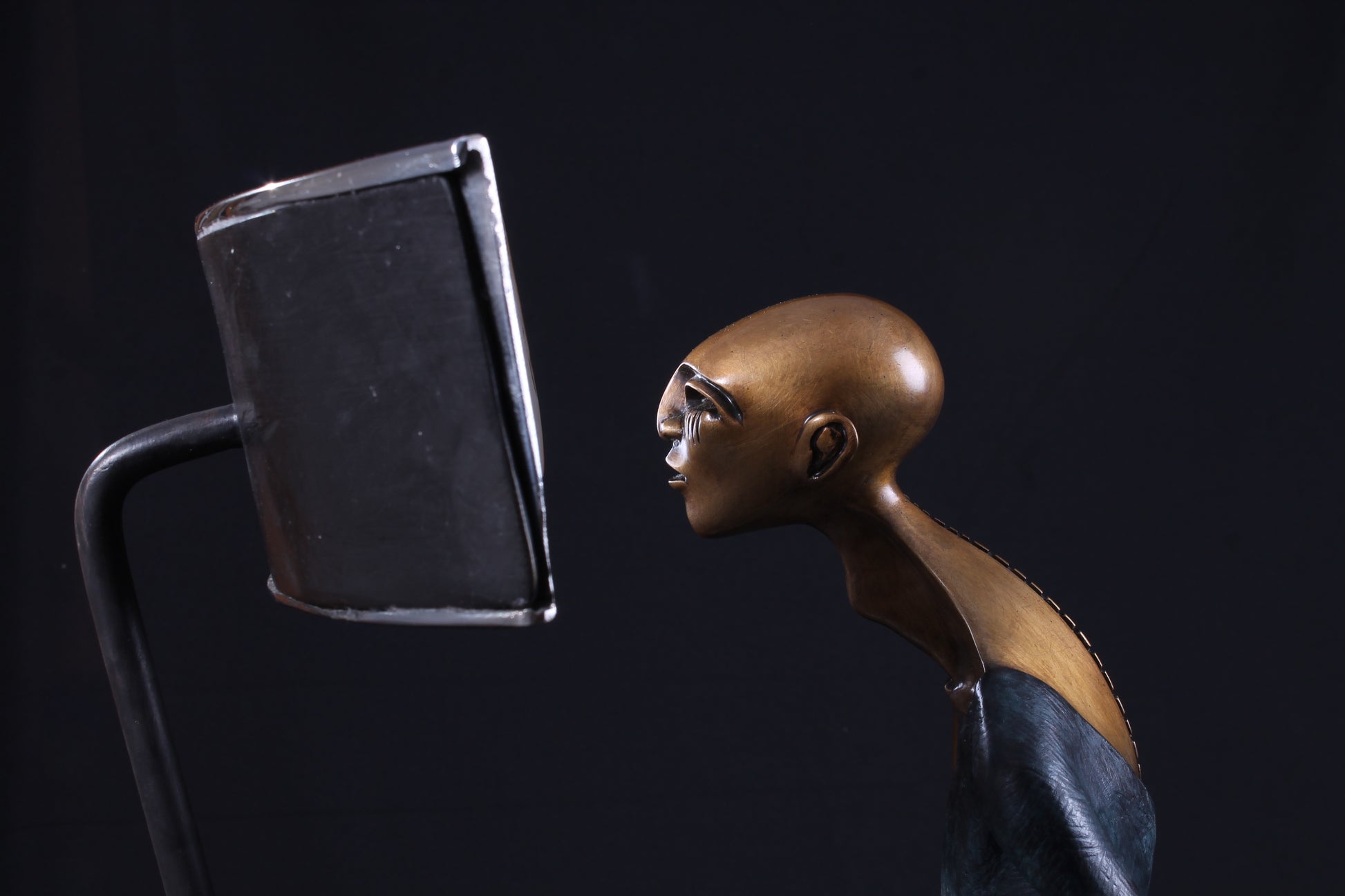 "Hombre Programado" Esta escultura refleja el flujo constante del aprendizaje e información que se transmite a un espectador, moldeando su percepción según lo que los medios de comunicación y la televisión deciden inculcar. Vivimos en una sociedad estructurada y planificada, donde la tecnología ha redefinido la forma de socializar y comunicarse. En este contexto, el pensamiento individual se convierte en un desafío frente a una sociedad que ofrece pocas vías para una expresión genuinamente libre.
