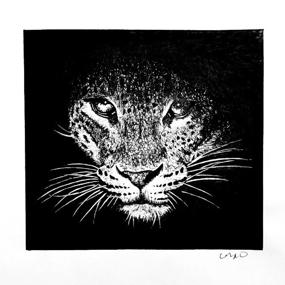 Ilustración de jaguar en estilo realista. Realizada con estilógrafos sobre papel utilizando la técnica scribble o garabatos. Lista para enmarcar.