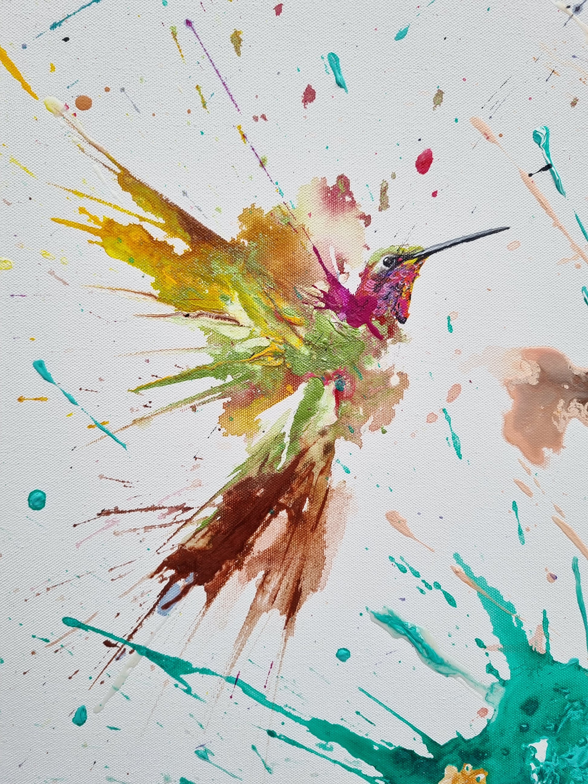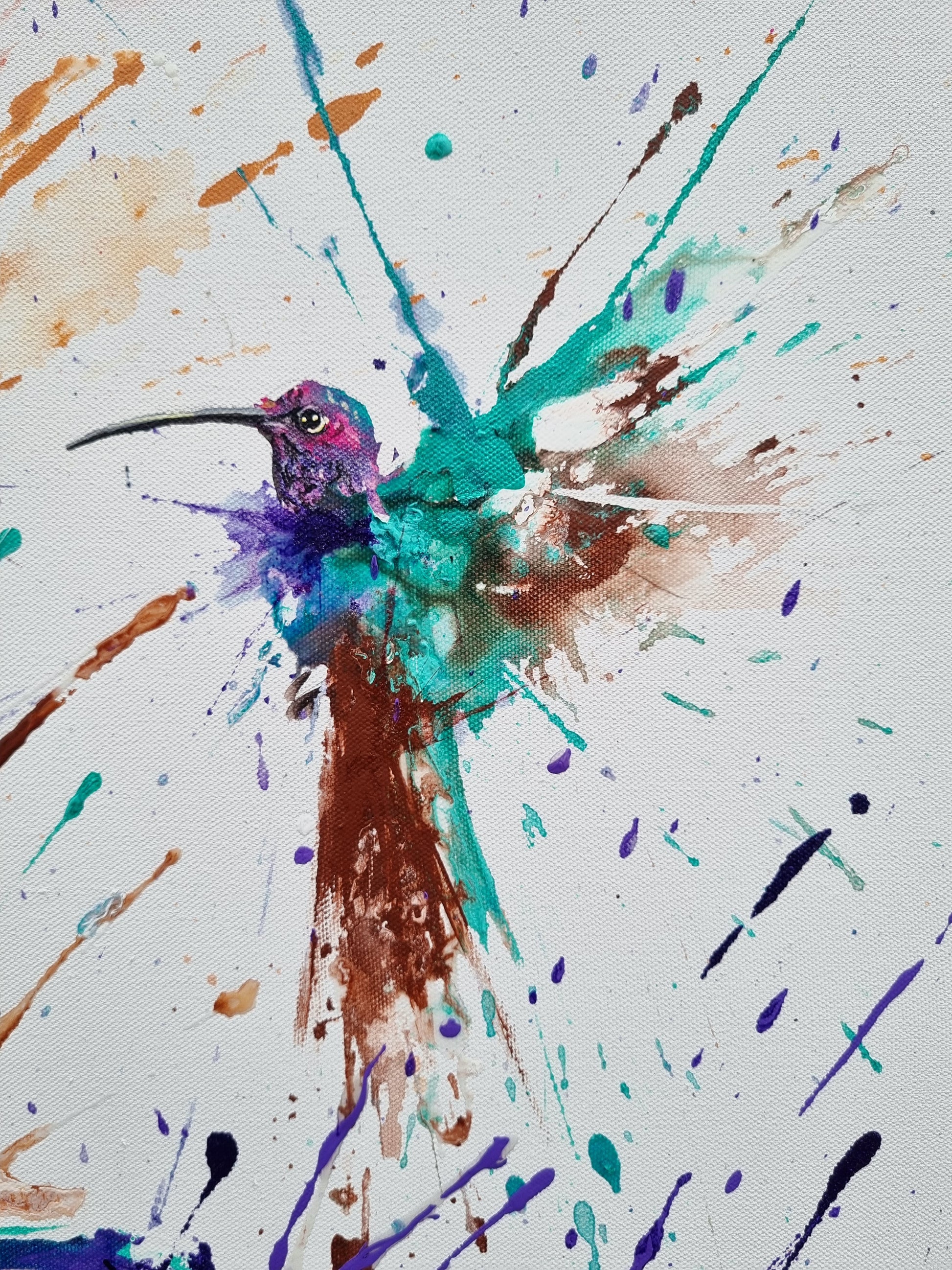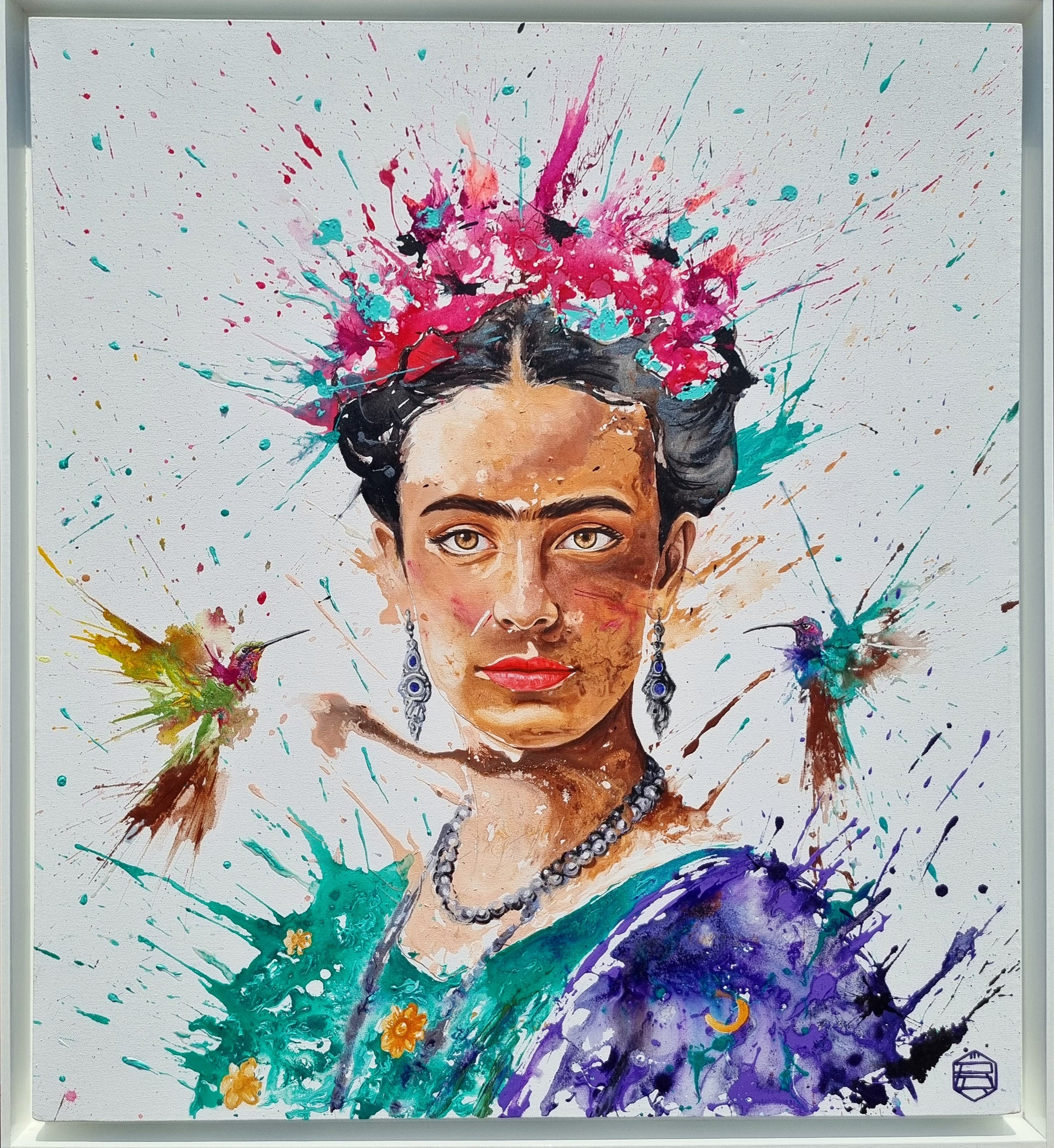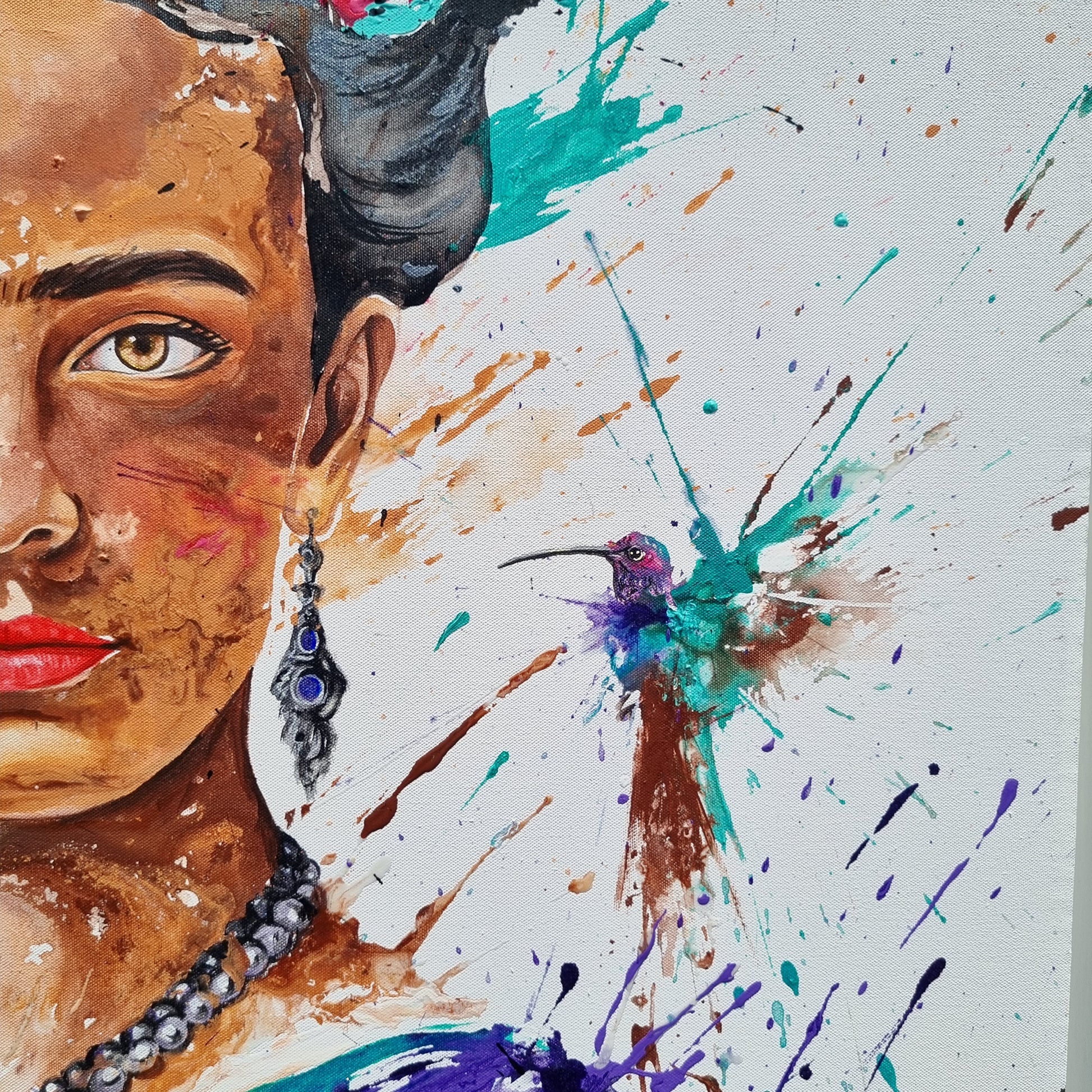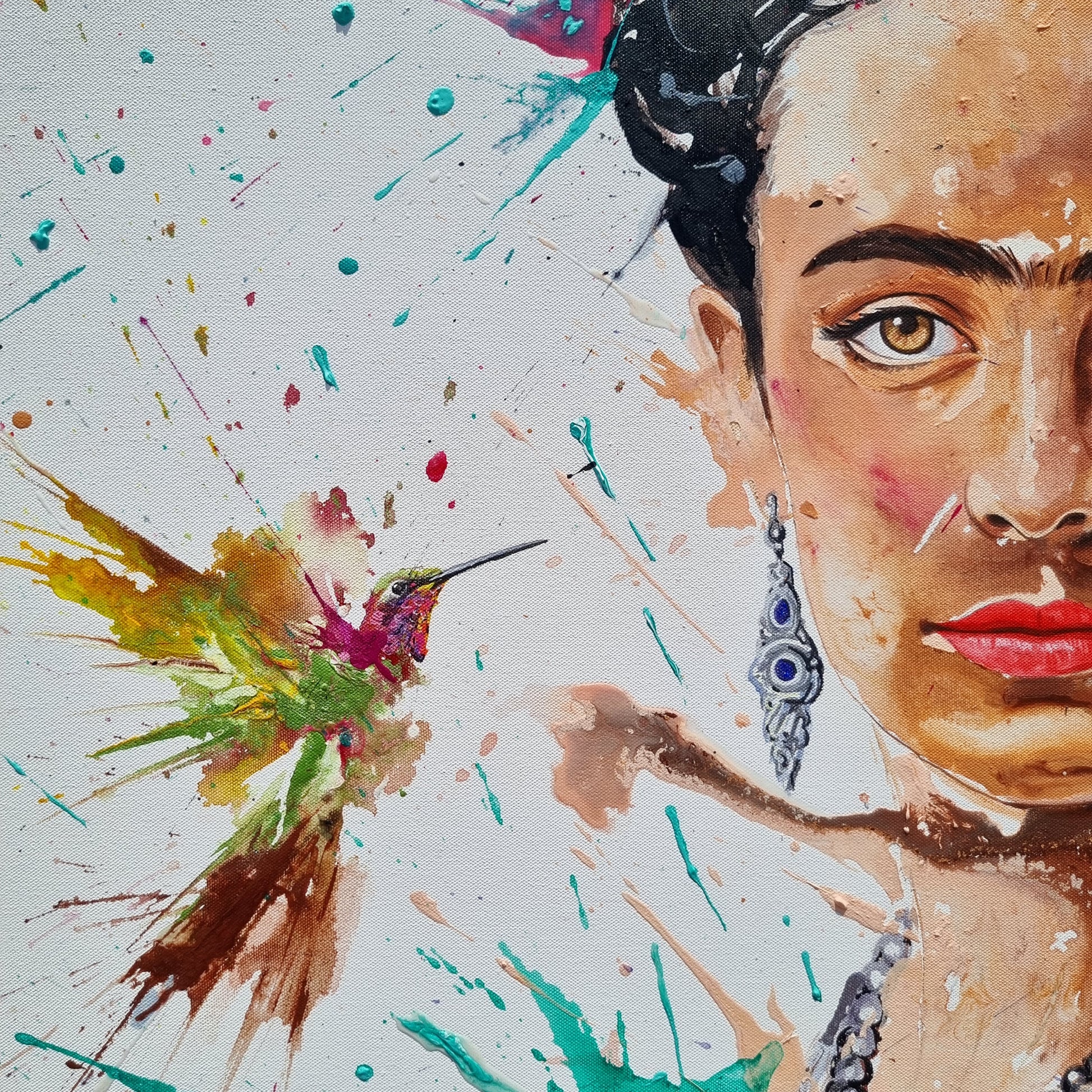 Es una pintura de una Frida feliz en pleno vuelo: ligera y libre, acompañada por dos colibríes, símbolo de la belleza interior, del amor y la creatividad.