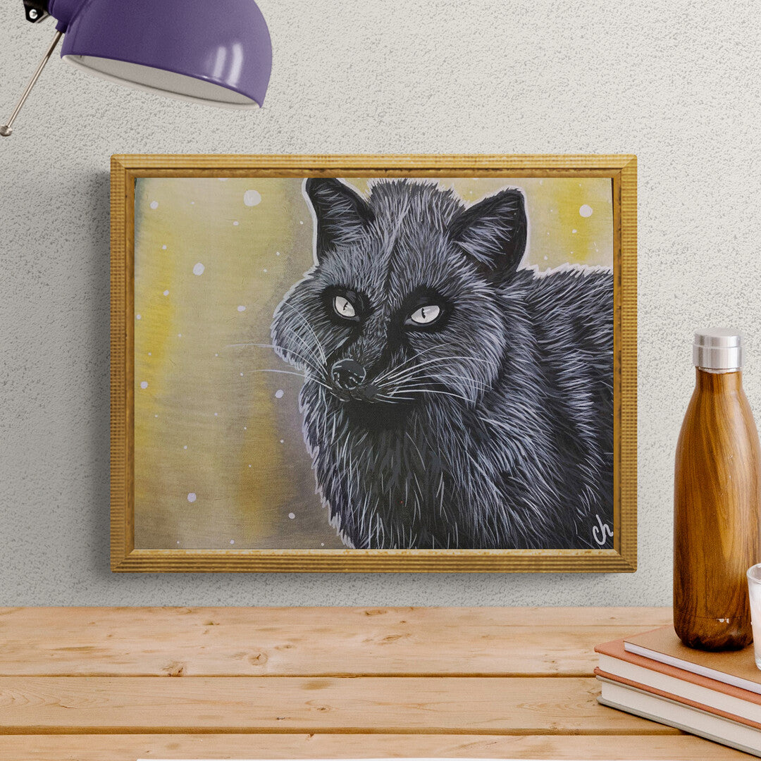 Una representación de un zorro con pelaje negro y blanco, una criatura hermosa inspiradora, con un manto de color poco común, hermoso y elegante
